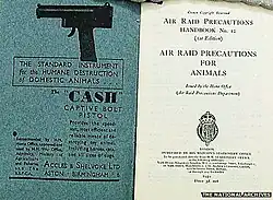 En 1939, alors que s'annonce la guerre contre l'Allemagne nazie et les bombardements de Londres, le gouvernement britannique crée le National Air Raid Precautions Animals Committee, qui réunit l'ensemble des associations de protection des animaux, chargé de décider ce qu'il faut faire des animaux de compagnie[1],[2]. Le comité craint que lorsque le gouvernement serait dans la nécessité de rationner la nourriture, les propriétaires d'animaux de compagnie ne soient obligés de partager leur ration avec des animaux peu essentiels à l'effort de guerre ou de les laisser s'affamer et donc souffrir[1]. C'est pourquoi le NARPAC publie un dépliant intitulé « Advice to Animal Owners » (litt. : Conseil pour les propriétaires d'animaux). Dans cette brochure, il est suggéré de conduire les animaux de compagnie hors des grandes villes vers la campagne[1],[2]. Elle se termine en établissant qu'en cas d'impossibilité de les faire garder, le plus acceptable serait de les euthanasier, présentant cet acte comme un geste de compassion[2]. La brochure est diffusée largement, notamment dans les journaux, et contient également une publicité pour un pistolet d'abattage qui pouvait être utilisé pour tuer l'animal de sorte à lui infliger le moins de douleur possible[1],[2].