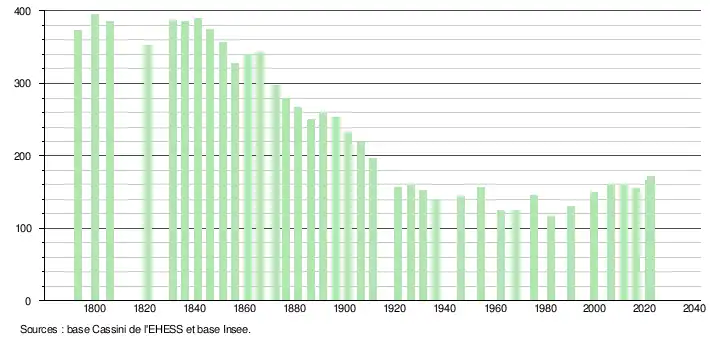 L'évolution du nombre d'habitants est connue à travers les recensements de la population effectués dans la commune depuis 1793. Pour les communes de moins de 10 000 habitants, une enquête de recensement portant sur toute la population est réalisée tous les cinq ans, les populations de référence des années intermédiaires étant quant à elles estimées par interpolation ou extrapolation[13]. Pour la commune, le premier recensement exhaustif entrant dans le cadre du nouveau dispositif a été réalisé en 2006[14].