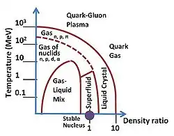 En analogie avec la thermodynamique des gaz réels, la matière nucléaire pourra exister sous différentes phases (voir infra). Mais à des énergies et/ou des pressions très élevées, on s'attend, sur la base de la liberté asymptotique de la chromodynamique quantique, à ce qu'elle devienne de la matière de quarks, qui est un gaz de Fermi dégénéré de quarks[4].
