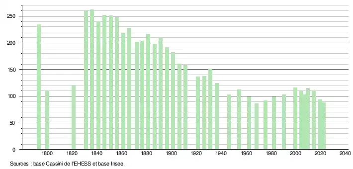 L'évolution du nombre d'habitants est connue à travers les recensements de la population effectués dans la commune depuis 1793. Pour les communes de moins de 10 000 habitants, une enquête de recensement portant sur toute la population est réalisée tous les cinq ans, les populations de référence des années intermédiaires étant quant à elles estimées par interpolation ou extrapolation[36]. Pour la commune, le premier recensement exhaustif entrant dans le cadre du nouveau dispositif a été réalisé en 2004[37].