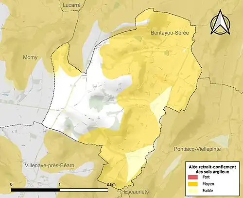 Le retrait-gonflement des sols argileux est susceptible d'engendrer des dommages importants aux bâtiments en cas d’alternance de périodes de sécheresse et de pluie[26]. 66,4 % de la superficie communale est en aléa moyen ou fort (59 % au niveau départemental et 48,5 % au niveau national)[Carte 3]. Depuis le , en application de la loi ELAN, différentes contraintes s'imposent aux vendeurs, maîtres d'ouvrages ou constructeurs de biens situés dans une zone classée en aléa moyen ou fort[Note 4],[27].