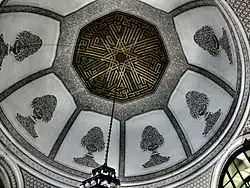 L'accès au monument se fait par un portail constitué d'un arc en plein cintre surbaissé reposant sur deux piédroits. Cette entrée ouvre sur un vestibule couvert en voûte d'arêtes qui comporte des portes encadrées de plaques en grès desservant cinq pièces destinées aux visiteurs[2]. Le vestibule mène à une salle, formant un espace intermédiaire surmonté d'une imposante coupole, qui précède la chambre funéraire[2].