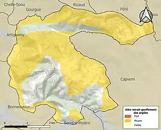 Le retrait-gonflement des sols argileux est susceptible d'engendrer des dommages importants aux bâtiments en cas d’alternance de périodes de sécheresse et de pluie. 66,5 % de la superficie communale est en aléa moyen ou fort (44,5 % au niveau départemental et 48,5 % au niveau national). Sur les 143 bâtiments dénombrés sur la commune en 2019, 108 sont en aléa moyen ou fort, soit 76 %, à comparer aux 75 % au niveau départemental et 54 % au niveau national. Une cartographie de l'exposition du territoire national au retrait gonflement des sols argileux est disponible sur le site du BRGM[30],[Carte 2].