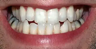 Les dents permanentes sont constituées de 8 incisives, de 4 canines, de 8 prémolaires et de 12 molaires dont l'inconstante dent de sagesse.