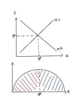 Un autre argument dit que pour chaque unité vendue, le bénéfice marginal (Mπ) = revenu marginal (MR) - coût marginal (MC). Ensuite, si le revenu marginal est supérieur au coût marginal, le bénéfice marginal est positif. Si le revenu marginal est inférieur au coût marginal, le bénéfice marginal est négatif. Lorsque le revenu marginal est égal au coût marginal, le bénéfice marginal est nul. Considérant qu'il y a augmentation de profit total lorsque le profit marginal est positif (et diminution lorsque le profit marginal est négatif), l'objectif est d'atteindre un maximum où le profit marginal est de zéro ou lorsque coût marginal = revenu marginal. S'il y a deux endroits où cela se produit, le profit maximum est atteint lorsque le producteur a collecté un profit positif jusqu'à l'intersection de MR et MC (zéro but lucratif sont recueillis), mais ne continueraient pas après (par opposition aux vice-versa), ce qui représente un but lucratif minimum. En ce qui concerne le calcul, l'intersection correcte de MC et MR se produit lorsque :