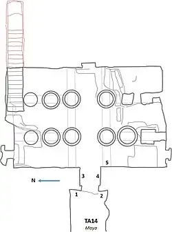 L'entrée de la tombe mène à une salle à piliers. Seuls les piliers du centre ont été achevés. L'espace est très endommagé par les chauves-souris et par un éventuel incendie[2]. L'entrée de la tombe présente une scène où Akhenaton et Néfertiti présentent un encensoir et des libations à Aton. Le couple royal est suivi de trois de ses filles et de la sœur de la reine, Moutbenet. Cette dernière est accompagnée de deux nains qui s'appellent Para et Rê-neheh. Dans d'autres scènes, May est représentée en train de prier. Norman de Garis Davies mentionne que le nom de May a été supprimé et son image détruite[2].