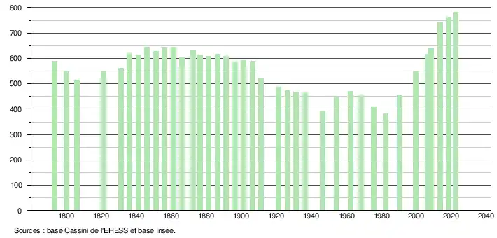 L'évolution du nombre d'habitants est connue à travers les recensements de la population effectués dans la commune depuis 1793. Pour les communes de moins de 10 000 habitants, une enquête de recensement portant sur toute la population est réalisée tous les cinq ans, les populations de référence des années intermédiaires étant quant à elles estimées par interpolation ou extrapolation[26]. Pour la commune, le premier recensement exhaustif entrant dans le cadre du nouveau dispositif a été réalisé en 2008[27].