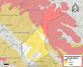 Les mouvements de terrains susceptibles de se produire sur la commune sont des tassements différentiels[20]. Le retrait-gonflement des sols argileux est susceptible d'engendrer des dommages importants aux bâtiments en cas d’alternance de périodes de sécheresse et de pluie[21]. 75,8 % de la superficie communale est en aléa moyen ou fort (54,9 % au niveau départemental et 48,5 % au niveau national)[Carte 2]. Depuis le , en application de la loi ELAN, différentes contraintes s'imposent aux vendeurs, maîtres d'ouvrages ou constructeurs de biens situés dans une zone classée en aléa moyen ou fort[Note 2],[22].