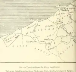 Les Mediouna du pays des Châouïa seraient donc un des restes de la grande tribu zénète des Béni Faten[3]. Il est intéressant de remarquer que les Mediouna, chassés de leur pays par deux tribus zénètes, firent probablement partie, dans la Chaouïa, d'une nouvelle confédération zénète, puisqu'ils devinrent les voisins des Zenata établis dans la même région.