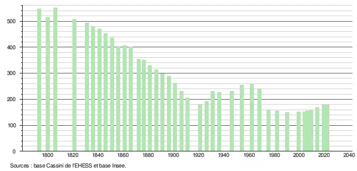 L'évolution du nombre d'habitants est connue à travers les recensements de la population effectués dans la commune depuis 1793. Pour les communes de moins de 10 000 habitants, une enquête de recensement portant sur toute la population est réalisée tous les cinq ans, les populations de référence des années intermédiaires étant quant à elles estimées par interpolation ou extrapolation[28]. Pour la commune, le premier recensement exhaustif entrant dans le cadre du nouveau dispositif a été réalisé en 2004[29].