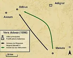 En un mois, Mekonnen a infligé aux Italiens deux défaites capitales qui présagent d'une troisième victoire éthiopienne. Pour le féliciter, Menelik, qui l'a nommé avant le conflit Fitawrari, soit le commandant en chef de l'avant-garde impériale, décide d'en faire le commandant en chef des armées impériales[85]. Après un conseil le , les troupes de Mekonnen partent avec les 1 500 prisonniers italiens afin de les escorter ; en vérité, il s'agit d'une ruse du Ras servant à protéger le flanc de l'armée éthiopienne[86]. En se rendant vers Adoua, l'armée impériale risque de se faire attaquer par les soldats italiens installés à Adigrat. Le 26, le gros de l'armée éthiopienne marche vers Adoua, sous protection des troupes de Mekonnen partis trois jours plus tôt[86].