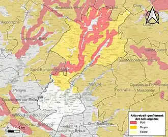 Les mouvements de terrains susceptibles de se produire sur la commune sont des tassements différentiels[16]. Le retrait-gonflement des sols argileux est susceptible d'engendrer des dommages importants aux bâtiments en cas d’alternance de périodes de sécheresse et de pluie[17]. 68,3 % de la superficie communale est en aléa moyen ou fort (54,9 % au niveau départemental et 48,5 % au niveau national)[18]. Depuis le , en application de la loi ELAN, différentes contraintes s'imposent aux vendeurs, maîtres d'ouvrages ou constructeurs de biens situés dans une zone classée en aléa moyen ou fort[Note 6],[19].