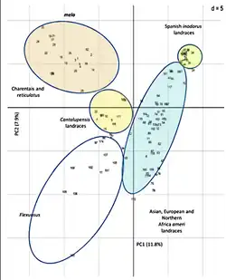 En 2016 Michel Pitrat divise le groupe des melons inodorus en trois : cassaba, ibericus et inodorus[2]. Almudena Lázaro et al. (2017) séquencent 62 variétés espagnoles de melon: 81 % de la population examinée appartient au type inodorus, les fruits sont ovales à elliptique du vert pâle au jaune et au vert foncé. Par rapport aux inodorus du Proche-Orient, d'Afrique du nord et d'Asie Centrale les melons espagnols ont des cycles végétatifs plus longs (117 jours jusqu'à maturité)[3]. Les généticiens espagnols ont montré (2015) qu'ils constituent un groupe clairement différencié[4]. Le groupe Inodorus est fortement représenté en Asie Centrale qui est une zone de primo-domestication.