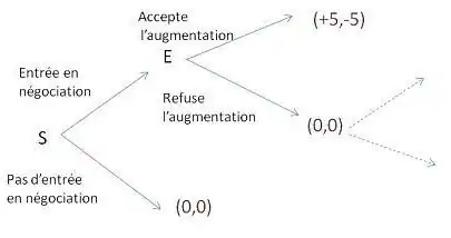 Le jeu est illustré sous forme extensive. Prenons le cas simple d’une négociation entre des salariés (S) et leur employeur (E). Les salariés initient la négociation, l’employeur répond. Les salariés souhaitent négocier une augmentation de salaire de +5 au total et coutera donc -5 à l’employeur. Sur le schéma : (x,y) représente les gains du jeu, x gain de S et y gain de E.