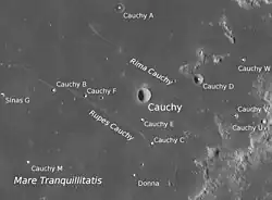 Enfin, au nord-est apparaît le cratère Cauchy ainsi que le Rupes Cauchy qui délimite cette partie de la rive septentrionale de la Mer de la tranquillité.