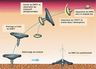 Déroulement de la descente d'une sonde Metnet : deux boucliers/parachutes gonflables sont successivement déployés puis la sonde effectue un atterrissage à grande vitesse.