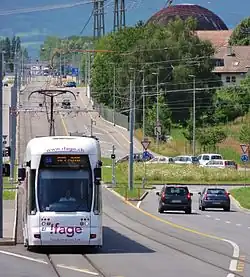 Tramway de la ligne 18 à l'arrêt Hôpital de La Tour.