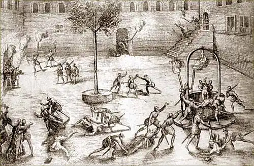 Le premier consul Guy Rochette, un catholique nommé de façon très contestée, tente en vain d'apaiser les émeutiers, et se voit contraint de se réfugier chez l'évêque Bernard d'Elbène. Le vicaire général et une vingtaine[1] de moines ou clercs sont incarcérés. Le , ils sont enlevés, massacrés et jetés dans un puits de la cour de l'évêché[2]. Lors de travaux trois siècles plus tard, les corps sont retrouvés empilés au fond du puits.