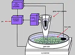 La SICM utilise le changement de résistance d'accès à une électrode dans une micro ou nano-pipette quand cette dernière est approchée près d'un échantillon. Le dispositif observe le courant ionique passant par la pointe de la micro/nano-pipette, courant qui décroît quand la pointe est suffisamment proche de l'échantillon pour que le flux d'ions soit entravé par la trop grande proximité de la surface.
