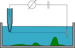 Une différence de potentiel est appliquée entre les deux électrodes Ag/AgCl, l'une étant dans la micro-pipette et l'autre dans le réservoir de solution. Cette différence de potentiel génère un courant ionique, donc un flux d'ions entrant et sortant de la micro-pipette. La conductance (et indirectement la résistance) entre les deux électrodes est mesurée, et dépend du flux d'ions en solution.