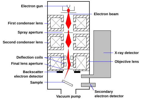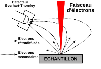 En microscopie optique classique, la lumière visible réagit avec l’échantillon et les photons réfléchis sont analysés par des détecteurs ou par l’œil humain. En microscopie électronique, le faisceau lumineux est remplacé par un faisceau d’électrons primaires qui vient frapper la surface de l’échantillon et les photons réémis sont remplacés par tout un spectre de particules ou rayonnements : électrons secondaires, électrons rétrodiffusés, électrons Auger ou rayons X. Ces différentes particules ou rayonnements apportent différents types d’informations sur la matière dont est constitué l’échantillon[11].