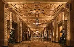 - ↑ Les deux grands lustres de la salle de bal, appelée à juste titre Crystal Ballroom, mesurent douze pieds de diamètre, soit près de 3,70 mètres.