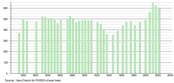 L'évolution du nombre d'habitants est connue à travers les recensements de la population effectués dans la commune depuis 1793. Pour les communes de moins de 10 000 habitants, une enquête de recensement portant sur toute la population est réalisée tous les cinq ans, les populations de référence des années intermédiaires étant quant à elles estimées par interpolation ou extrapolation[26]. Pour la commune, le premier recensement exhaustif entrant dans le cadre du nouveau dispositif a été réalisé en 2006[27].