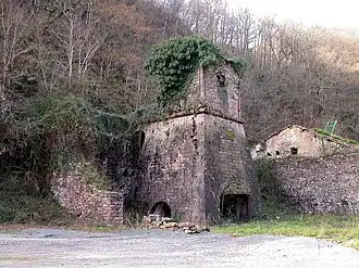 Des tentatives de relance de l'exploitation du cuivre, dirigées par le dernier actionnaire de la société parisienne des « Mines de Baïgorry », restèrent infructueuses[2]. Un capitaliste parisien, Jean-Baptiste Ricqbour, sans doute attiré par le faible coût local du combustible, le charbon de bois, construisit à partir de 1825 une usine à haut-fourneau sur les ruines de la fonderie. On alimentait cette grande forge pour l'essentiel avec une sidérite extraite du puissant filon d'Oustéléguy, sur les flancs du Larla, massif situé à l'extrémité septentrionale de la vallée. Si l'histoire de l'usine de Banca n'est pas le sujet de cet article, son évocation est indispensable, puisque le haut fourneau, quasiment intact, constitue l'édifice emblématique du site. Une erreur fréquente consiste d'ailleurs à attribuer ces vestiges à la métallurgie du cuivre, ou encore à imaginer que les mines de Banca fournissaient leur minerai au haut-fourneau, ce qui est absolument inexact[3]. Si l'usine à fer profita des aménagements hydrauliques de l'ancienne fonderie et de la proximité des massifs forestiers du sud de la vallée, le minerai qu'on y traitait n'était pas extrait sur place.