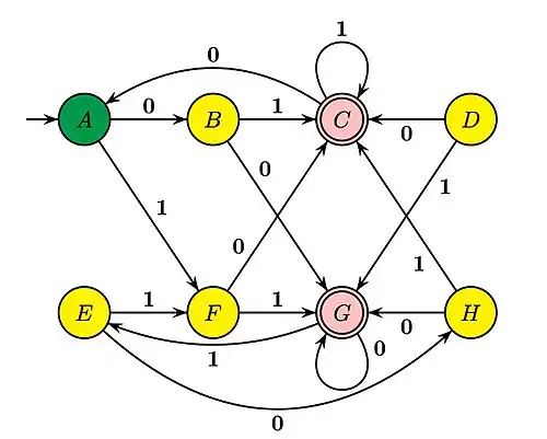 - ↑ Hopcroft, Motwani et Ullman 2007, Section 4.4.3, "Minimization of DFA's", p. 159.