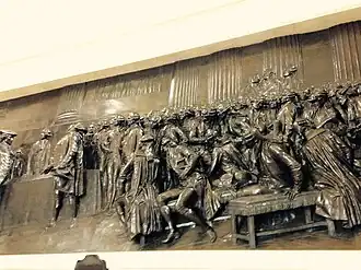 Dalou souhaite que la pièce soit fondue en bronze à cire perdue d'un seul jet, technique qui permet de conserver toutes les finesses du modelage original, mais qui représente un tour de force exceptionnel pour un haut-relief de cette dimension. Il s'adresse au fondeur Eugène Gonon[7], le seul, à ses yeux, capable de mener à bien une telle opération. Au terme de péripéties techniques diverses[8], le bronze est achevé en 1890 et installé dans l'actuelle salle Casimir-Perier au palais Bourbon en 1891[9].
