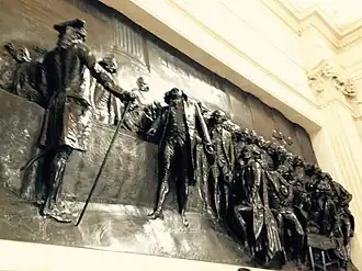 Le haut-relief représente une scène de la séance royale du 23 juin 1789 durant les États généraux de 1789, dans une salle de l'hôtel des Menus-Plaisirs de Versailles. Alors que le roi demande aux délégués de se séparer, il n'est suivi que par la noblesse et une partie du clergé. La demande du roi est réitérée à Jean Sylvain Bailly par le grand maître des cérémonies, Henri-Évrard de Dreux-Brézé, qui lui rétorque : « La Nation assemblée ne peut recevoir d'ordre ». Puis Mirabeau se serait avancé pour dire : « Allez dire à ceux qui vous envoient que nous sommes ici par la volonté du peuple, et qu'on ne nous en arrachera que par la puissance des baïonnettes. »