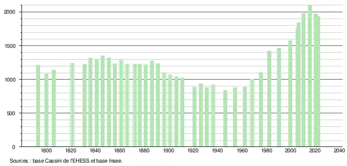L'évolution du nombre d'habitants est connue à travers les recensements de la population effectués dans la commune depuis 1793. Pour les communes de moins de 10000habitants, une enquête de recensement portant sur toute la population est réalisée tous les cinqans, les populations de référence des années intermédiaires étant quant à elles estimées par interpolation ou extrapolation[24]. Pour la commune, le premier recensement exhaustif entrant dans le cadre du nouveau dispositif a été réalisé en 2005[25].