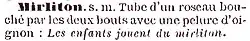 - ↑ Article Mirliton de l'Abrégé du dictionnaire de l'Académie française, d'après la dernière édition de 1878, ancien vocabulaire Nodier, entièrement refondu, et suivi d'un appendice comprenant tous les mots en usage non encore admis par l'Académie et d'un dictionnaire de géographie ancienne et moderne, Éditeur : imprimerie de Firmin-Didot, Paris 1883, page 618.