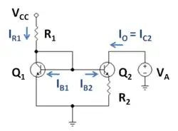 - miroir de courant de Widlar (en) avec une résistance en série avec l'emetteur du transistor de sortie. Il a été breveté par Robert Widlar en 1967[1].