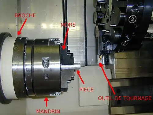 Pour les opérations de tournage, la pièce est serrée dans un mandrin solidaire de la broche de la poupée fixe. La pièce est serrée par des mors mobiles qui assurent le centrage de la pièce.