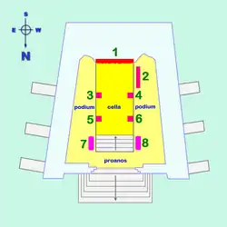 De forme trapézoïdale, l'extrémité nord étant plus large que l'extrémité sud (5,50 m de large contre 3,65 m), le sanctuaire mesure 5,50 m de long. Il est orienté du nord au sud, les côtés sud et est du sanctuaire étant creusés dans la roche naturelle et les côtés nord et ouest étant construits en pierre. Quatre marches mènent à l'allée centrale (cella) du sanctuaire qui se trouve à 80 cm sous le niveau du pronaos et des deux banquettes latérales qui l'entourent, tous au niveau du sol. On ne sait pas exactement de quel type de voûte le sanctuaire était initialement recouvert et quelle était sa hauteur. Les dimensions du sanctuaire ne permettaient d'accueillir qu'une très petite communauté de 18 à 20 personnes maximum.