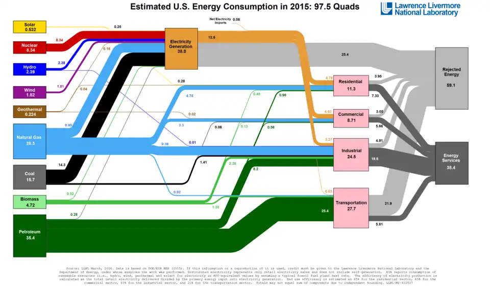 - ↑ (en) « Energy Flow Charts : Charting the Complex Relationships among Energy, Water, and Carbon » [« Diagrammes de flux énergétiques »], sur Lawrence Livermore National Laboratory.