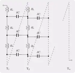 Un autre exemple où un simple modèle unidimensionnel ne suffit pas est celui des enroulements d'une bobine. Les bobines d'inductance filaires ont une capacité entre les spires adjacentes (ainsi qu'entre les spires plus éloignées, mais l'effet diminue progressivement). Pour un solénoïde à une seule couche, la capacité distribuée se situe principalement entre les spires adjacentes, comme le montre la figure 4, entre les spires T1 et T2, mais pour les enroulements à plusieurs couches et les modèles plus précis, la capacité distribuée vers d'autres spires doit également être prise en compte. Ce modèle est assez difficile à traiter dans des calculs simples et, dans la plupart des cas, il est évité. L'approche la plus courante consiste à regrouper toute la capacité distribuée en un seul élément forfaitaire en parallèle avec l'inductance et la résistance de la bobine. Ce modèle forfaitaire fonctionne bien aux basses fréquences mais s'effondre aux hautes fréquences où la pratique habituelle consiste simplement à mesurer (ou à spécifier) un coefficient de qualité Q global pour la bobine sans y associer un circuit équivalent spécifique[4].