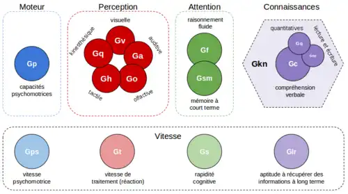 | - | Connaissances quantitatives (Gq) | - | capacité de comprendre les concepts et les relations quantitatives et de manipuler des symboles numériques. Pour Carroll, cette aptitude est comprise dans l'intelligence fluide (Gf) | |