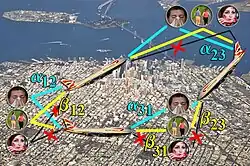 La population réelle est répartie dans plusieurs villes. À l'intérieur d'une ville, les individus peuvent se contaminer. Un individu contaminé peut se déplacer dans une autre ville et y propager la maladie, et d'une façon similaire un individu sain peut se déplacer dans une ville où il sera infecté et ramener la maladie dans sa ville d'origine. Modéliser ces aspects permet de prendre en compte l'évolution de la maladie dans un espace. Le modèle de Bartlett est cité par Arino[C 11] comme le premier à avoir pris en compte l'aspect spatial. Les individus sont dans deux états possibles, et . Deux endroits sont définis : les individus se trouvant au premier peuvent être dans les états et , tandis que les individus se trouvant au second peuvent être dans les états ou . Afin d'autoriser les déplacements de population, il est possible pour un individu de changer d'état entre et d'une part, et entre et d'autre part. Le modèle de Bartlett ne se limite pas au strict déplacement d'individus entre les deux endroits puisqu'il considère que les individus dans deux villes interagissent : par exemple, la proportion d'individus de devenant infectée n'est pas simplement mais , ce qui représente l'hypothèse que tous les individus dans sont en contact avec un même nombre d'individus dans et .