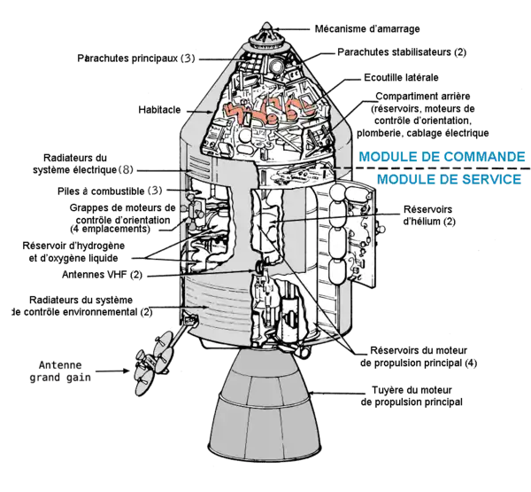 Le véhicule spatial Apollo (ou module de commande et de service, abrégé en CSM) transporte les astronautes avant de les placer en orbite autour de la Lune, puis les ramène sur Terre. Ses deux principaux objectifs sont de fournir un environnement vivable durant une dizaine de jours à l'équipage et de réaliser les principales manœuvres permettant d'atteindre la Lune, de s'insérer en orbite, de quitter cette orbite puis de se diriger vers la Terre. Pesant plus de 30 tonnes, il est pratiquement dix fois plus lourd que le vaisseau du programme Gemini. La masse supplémentaire (21,5 tonnes) est en grande partie représentée par le moteur et les ergols, qui fournissent un delta-v de 2 800 m/s permettant au vaisseau de s'insérer en orbite lunaire puis de quitter cette orbite. Le vaisseau Apollo reprend une disposition inaugurée avec le vaisseau Gemini : un module de commande (CM) abrite l'équipage et un module de service (SM) contient le moteur de propulsion principal, l'essentiel des sources d'énergie ainsi que l’équipement nécessaire à la survie des astronautes. Le module de service est largué juste avant la rentrée atmosphérique qui précède l'atterrissage[9].