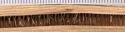Généralement blanche ou de couleur claire quand elle est nouvellement formée, elle prend en vieillissant une couleur brune plus foncée par accumulation de tanins sombres.