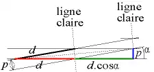 Par ailleurs, l'espacement entre deux lignes claires est égal à la grande diagonale (c'est également la distance séparant deux lignes sombres). Cette grande diagonale D est l'hypoténuse d'un triangle rectangle dont les côtés de l'angle droit valent d(1+cos α) et p. D'après le théorème de Pythagore, on a :