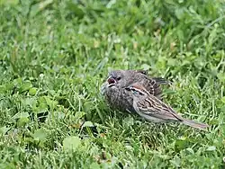 Bruant familier accompagnant un Vacher à tête brune juvénile.