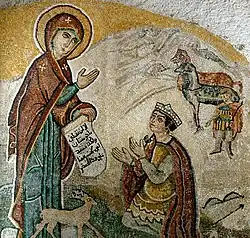 Mosaïque murale représentant l'apparition de la Vierge à l'empereur Justinien ; elle tient un rouleau déplié avec le texte en arabe : لا لن تقتلني يا جوستنيان ولكنك ستشيد لي كنيسة هنا على هذا الصخر Non, tu ne me tueras pas, Justinien, mais tu bâtiras une église pour moi, ici, sur ce rocher »). Œuvre réalisée en marbre et pierres naturelles par l'artiste mosaïste syrienne Houda Moussa en 2003.