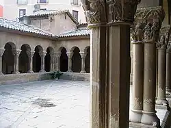Le cloître rectangulaire est entouré de colonnes doubles couvertes d'arcs outrepassés. Les 38 chapiteaux des colonnes (dont 18 sont originaux, les autres étant des copies du XIXe siècle) sont élaborés et représentent la vie de Jésus ou des scènes à caractère allégorique et historique. Autour du cloître se trouvent plusieurs chapelles d'intérêt : la chapelle Sainte-Anne et Saint-Joseph du XIIIe siècle, la chapelle Saint-Benoît du XIIIe siècle, et la chapelle Saint-Barthélémy du XIIe siècle, ancienne salle capitulaire, elle servit de panthéon royal pour les rois d'Aragon Alphonse Ier et Ramire II. Les anciennes dépendances des moines abritent aujourd'hui des pièces d'orfèvrerie, des statues...