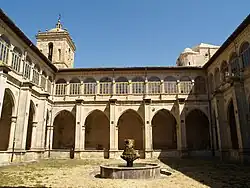 Il s'agit d'un des meilleurs exemples du style plateresque, selon les plans de Martín de Oyarzábal, tant par son plan que par l'ornementation sculpturale, dans laquelle alternent des scènes religieuses et mythologiques. Il est décoré de culs-de-lampe et de chapiteaux qui relatent la vie du Christ et de saint Benoît.