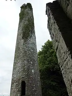 - Une haute tour ronde monastique, tout à fait similaire aux autres round towers monastiques typiques du Haut Moyen Âge irlandais. La tour elle-même est bien conservée mais sa toiture conique a presque totalement disparu, seules en restent quelques assises inférieures.