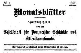 Le Monatsblätter der Gesellschaft für pommersche Geschichte und Altertumskunde est une revue nouvellement publiée en 1887 par la Société d'histoire, d'antiquité et d'art de Poméranie. Le premier rédacteur en chef est Martin Wehrmann. Les éditeurs sont les sociétés Stettin F. Hessenland, à partir de 1896 Herrcke et Lebeling et à partir de 1915 Léon Saunier. À la fin de 1942, la revue est interrompue en raison de la guerre.