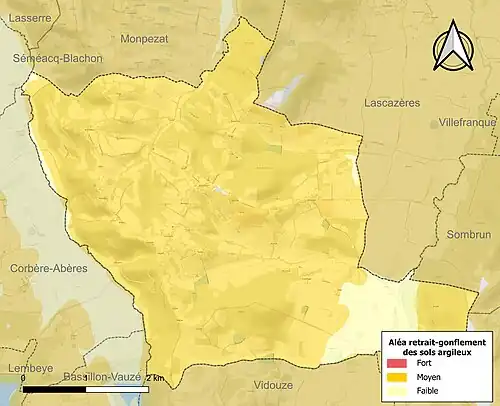 Le retrait-gonflement des sols argileux est susceptible d'engendrer des dommages importants aux bâtiments en cas d’alternance de périodes de sécheresse et de pluie[30]. 92,4 % de la superficie communale est en aléa moyen ou fort (59 % au niveau départemental et 48,5 % au niveau national)[Carte 5]. Depuis le , en application de la loi ELAN, différentes contraintes s'imposent aux vendeurs, maîtres d'ouvrages ou constructeurs de biens situés dans une zone classée en aléa moyen ou fort[Note 5],[31].